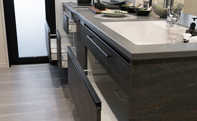 システムキッチン下部の収納は、引き出したときに内部がすべて見えるオールスライド式。何がどこにあるかがひと目でわかります。