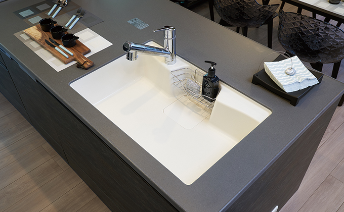 高級感のある人大シンク。天板とボウルの継ぎ目がない一体型で、キズや衝撃にも強く、美しさが長持ちします。