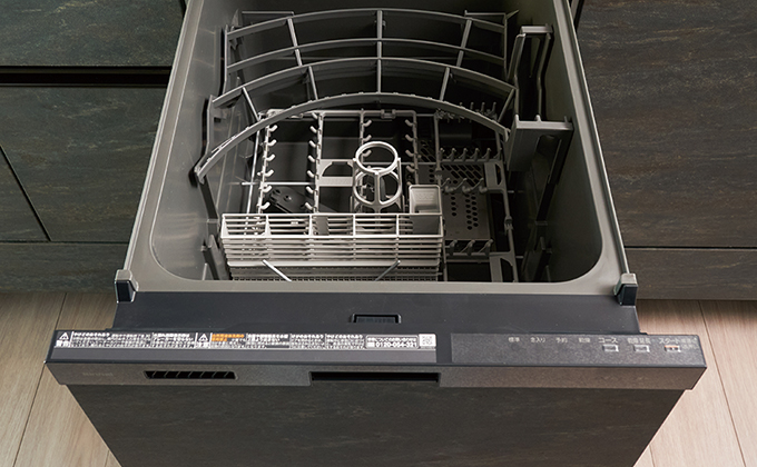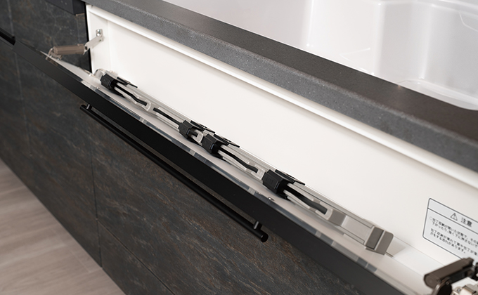 シンクとの隙間・幕板内部を活用して包丁をスッキリと収納します。安全に配慮したキッズロック機能付きです。