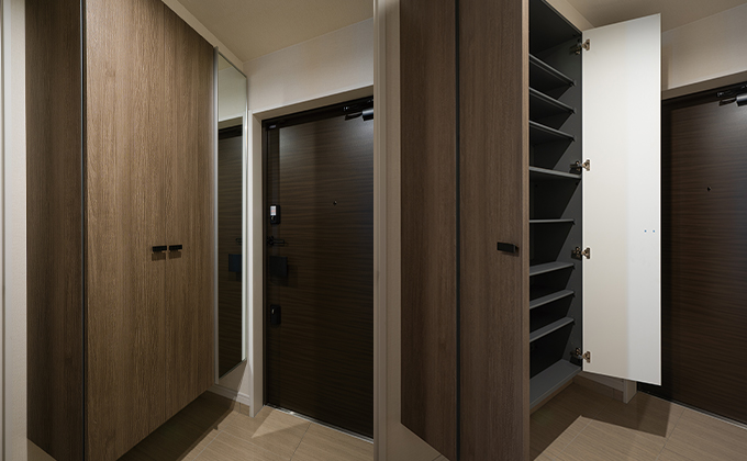 大容量のシューズボックスを配しています。おしゃれなご家族のフットウェアを余裕で収納できます。