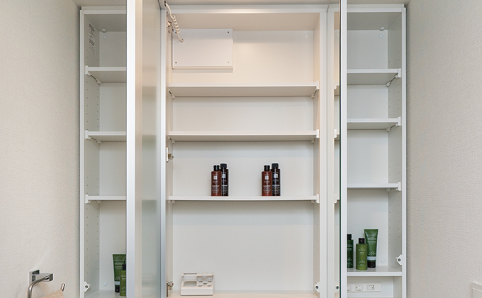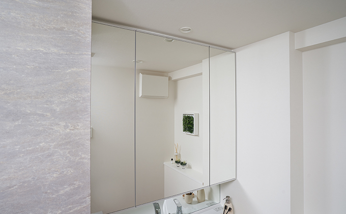 内部に収納スペースを設けた三面鏡を標準装備。不足しがちな洗面室の収納力をアップしました。