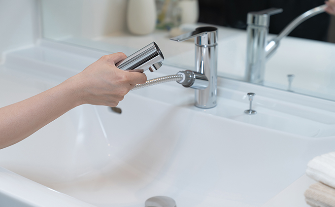 水栓は片手でスムーズに操作できるシングルレバータイプ。蛇口を引き出せるためのボウル内のお手入れもすみずみまでキレイにできます。
