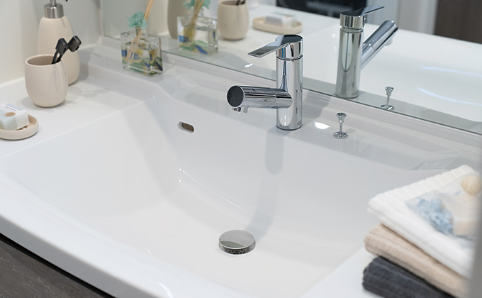 天板とボウルの継ぎ目がない一体型。スクエアなボウル形状と人造大理石天板で洗面台まわりにモダンな高級感が漂います。