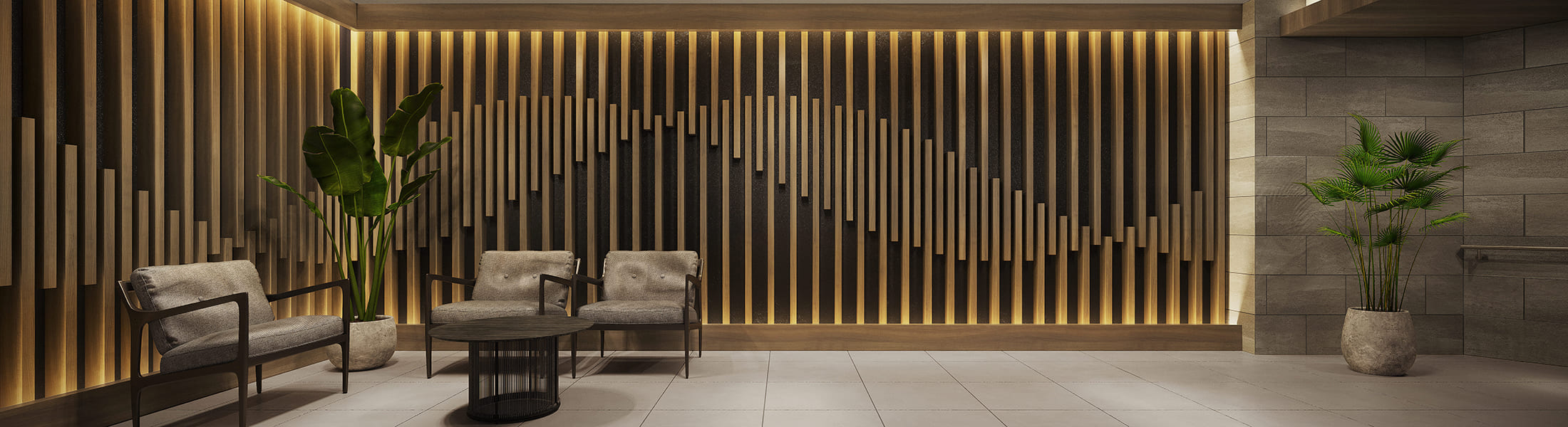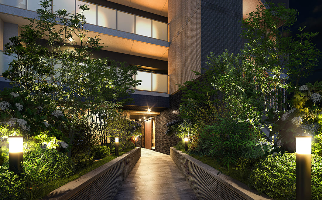両サイドで緑の木々がお迎えするアプローチは、エントランスホールに足を踏み入れるまでの、こころ穏やかなプロローグタイム。