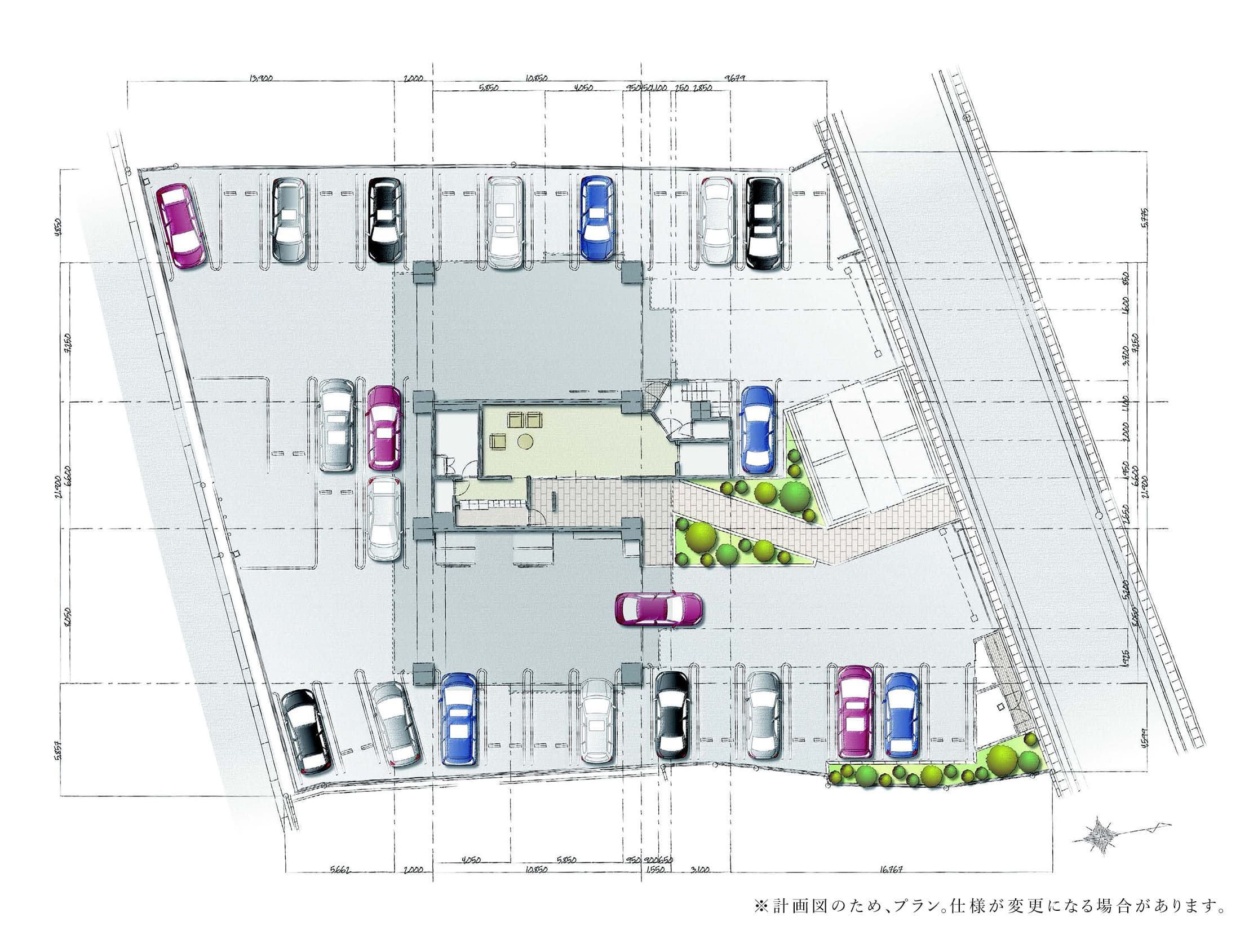 100%平置駐車場と、歩車分離動線、安全な暮らしに配慮しています。